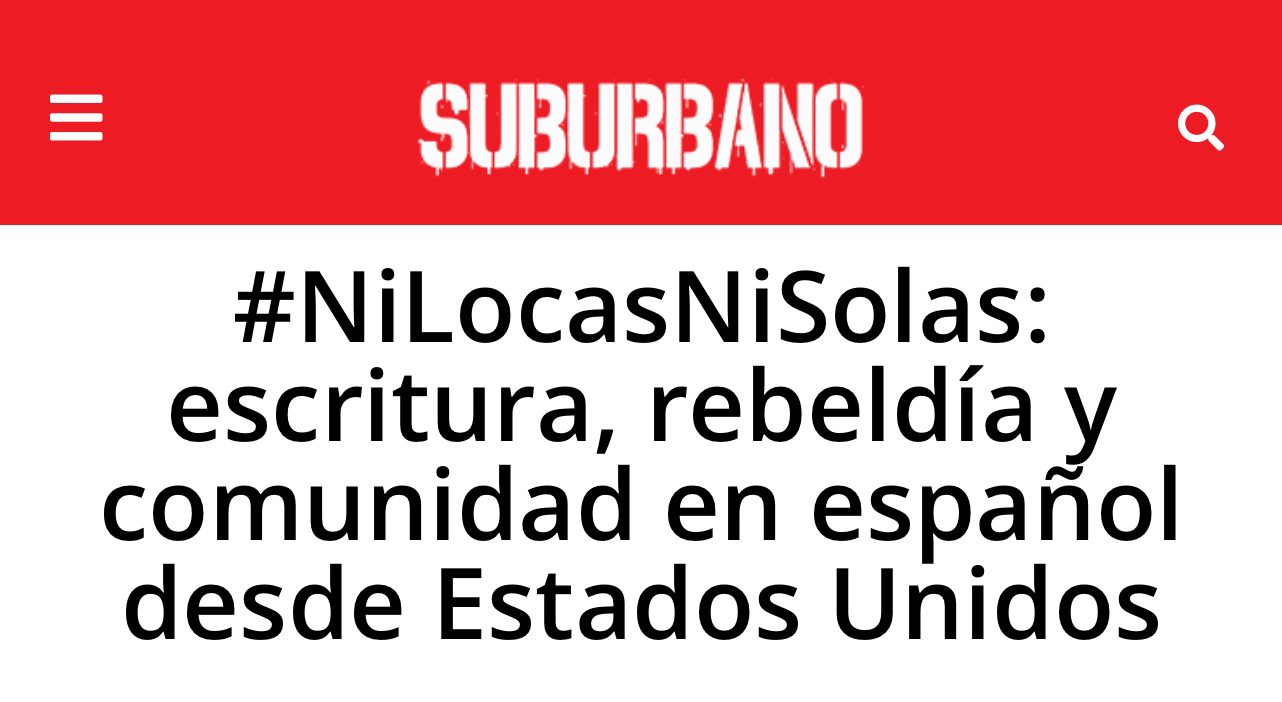 ¡Muchísimas gracias a Pedro Medina León por esta entrevista para la revista Suburbano en la que Naida Saavedra, Maya Piña y esta servidora desentrañamos lo que conllevó coeditar la antología #NiLocasNiSolas: Narrativa escrita por mujeres en Estados Unidos, nuestra visión….. LEER AQUÍ